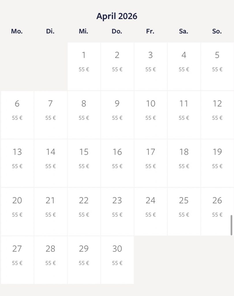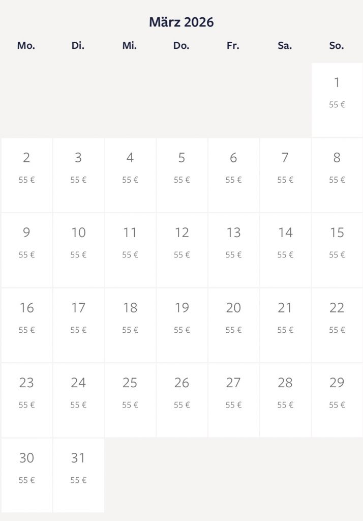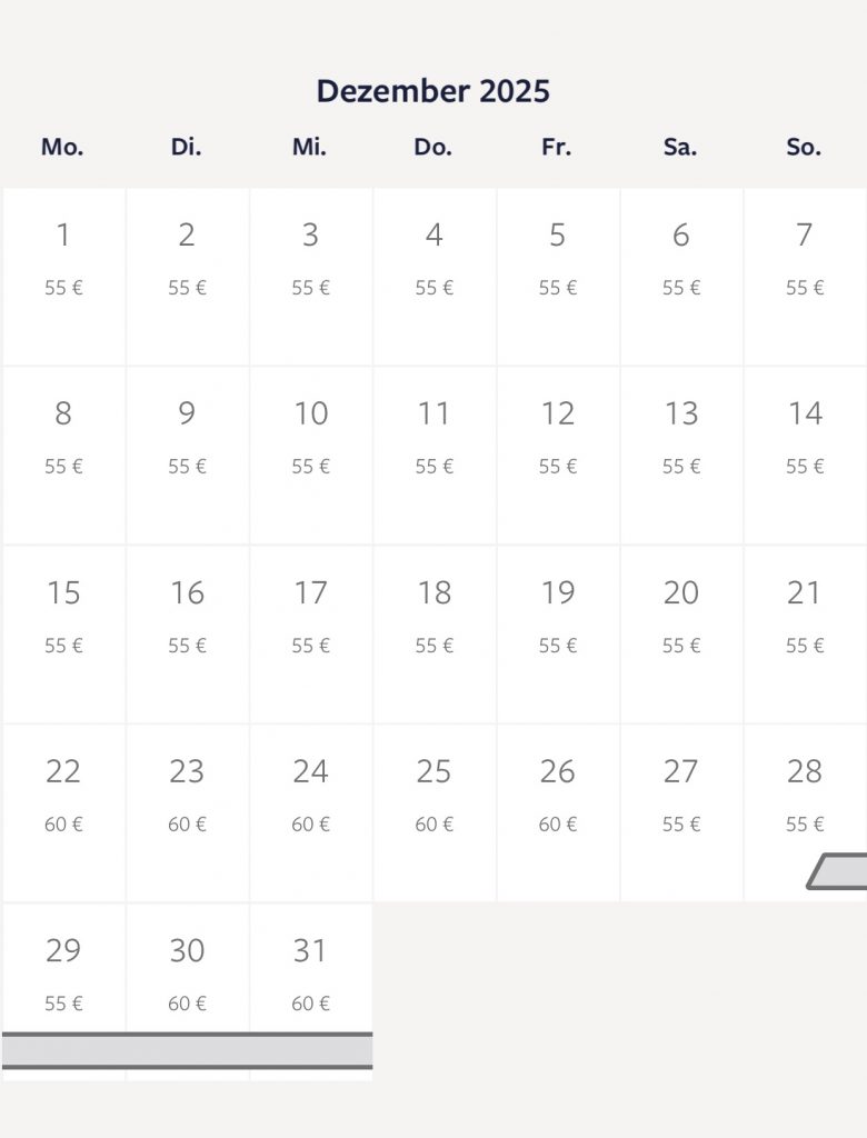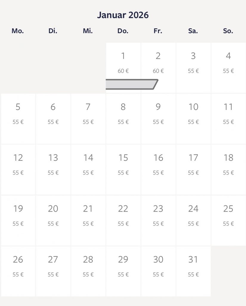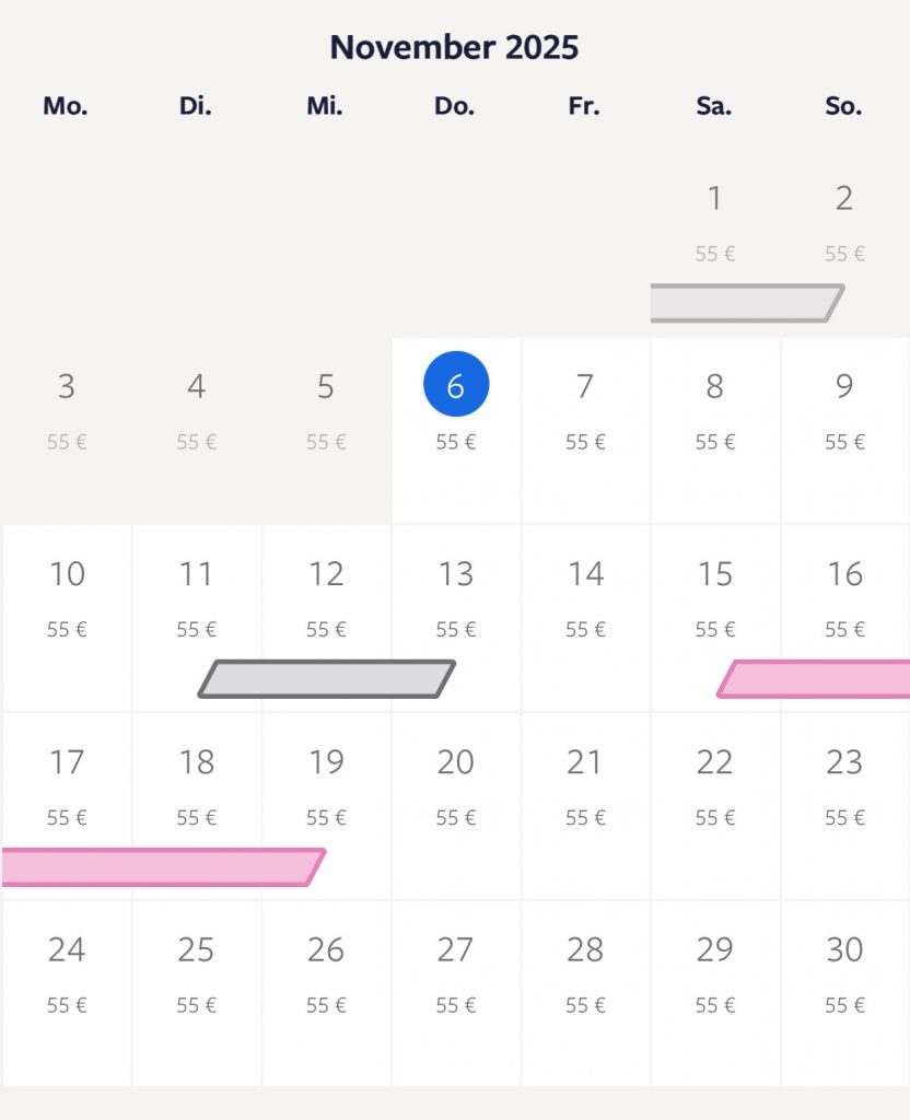 Gestrichene Tage (grau+grün+rot) stehen nicht mehr zur Verfügung.